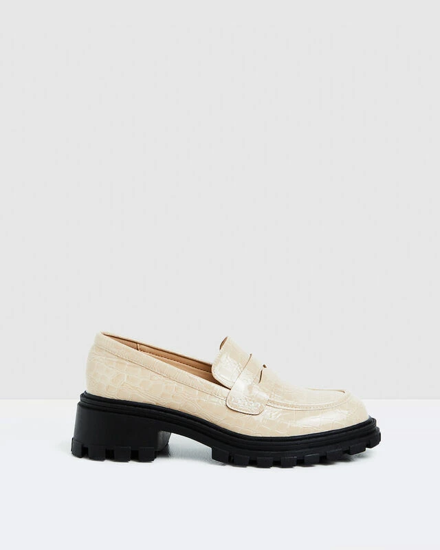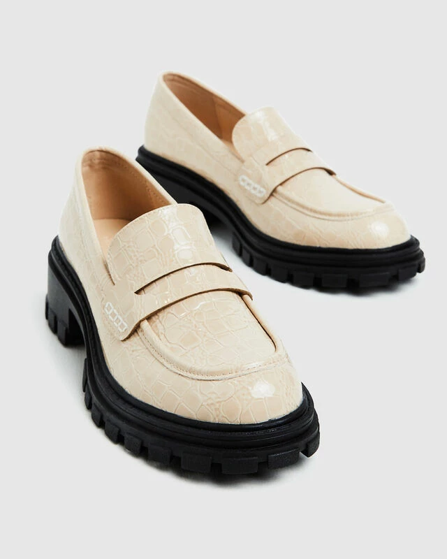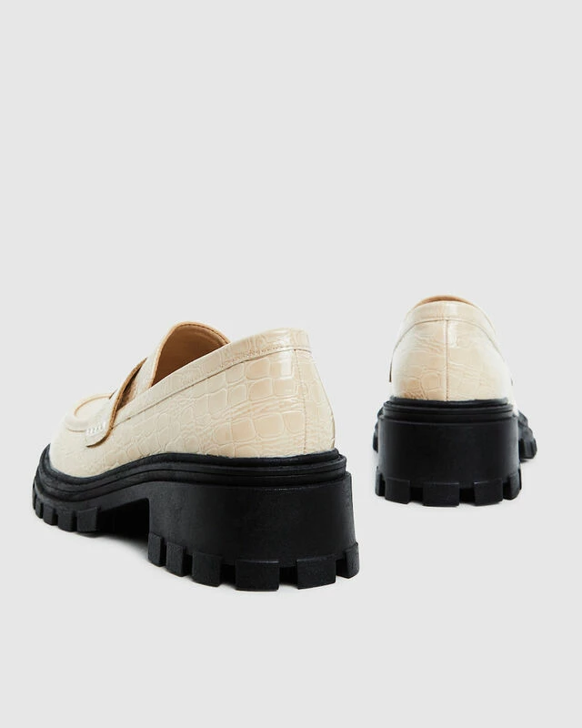 The Lennon Croc Loafer by Alice in the Eve comes in a bone colourway and features a sleek croc pattern with a shiny finish. The shoe is designed in a loafer style with a higher sole for extra height and buckle like detailing on the top