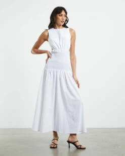 The Lottie Dress by SNDYS is a maxi length dress with an open side and back. The flowy dress comes in a white colourway, featuring a high round neckline, elasticated panel at the waist and button closure at neckline. Complete the look with a pair of slides of sandals for a effortless summer vibe.