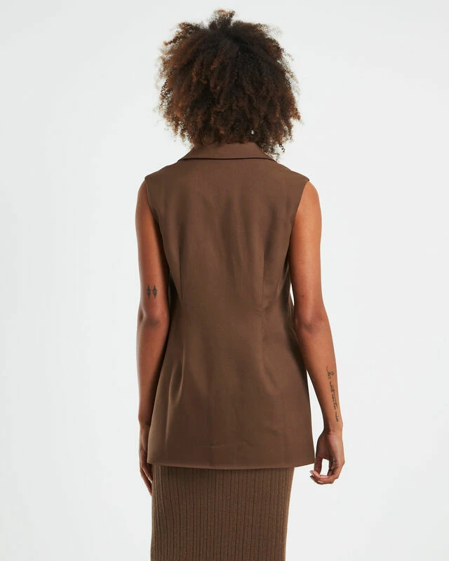 The Lyka Sleeveless Blazer by Subtitled comes in a chocolate brown colourway. The blazer features a sleeveless cut, collared neckline, notched lapel and button fastening on waist.
