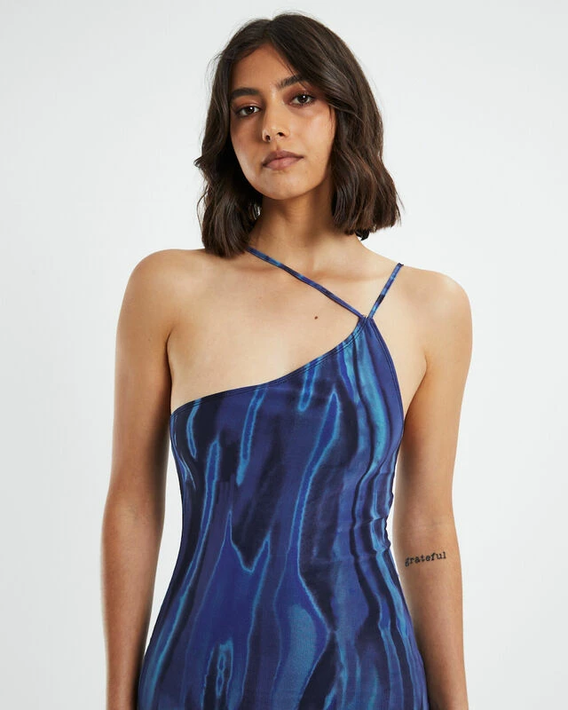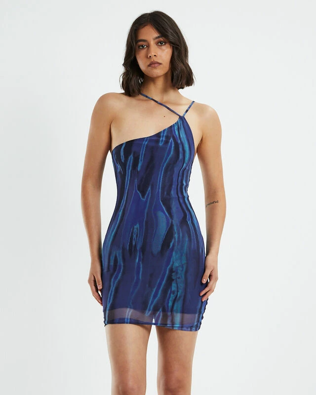 The Marda Mini Dress by Motel Rocks comes in a blue colourway with abstract print all over. Featuring a mini length, one shoulder strap design, slim fit, thin spaghetti straps, lining and finished off with premium trims. Style back with heels for the perfect night out.