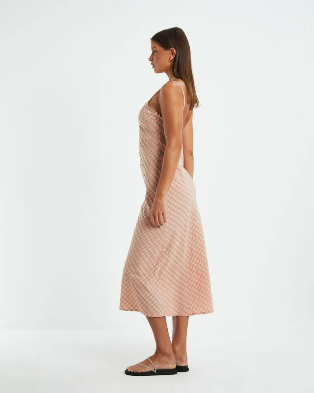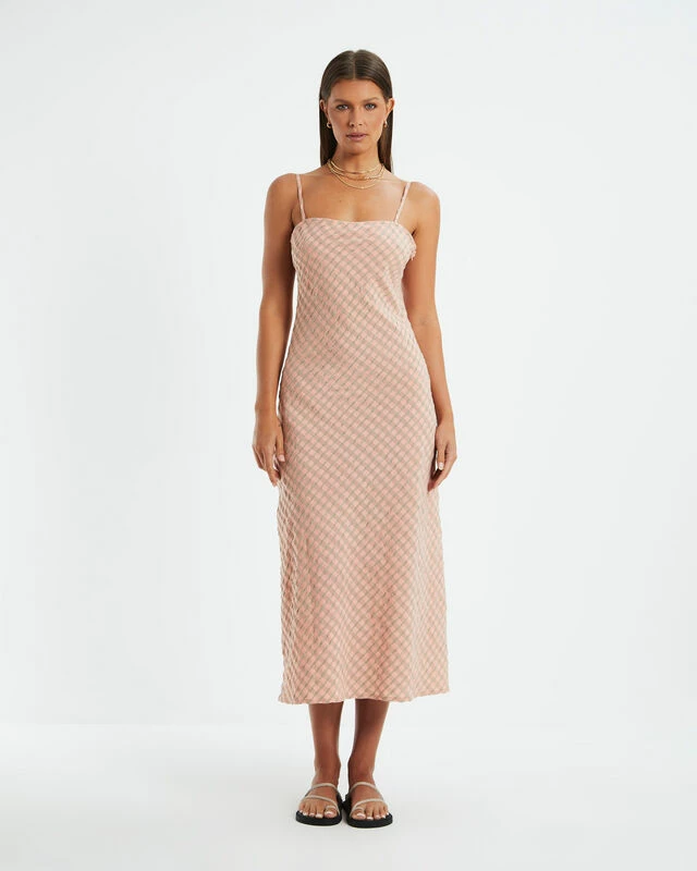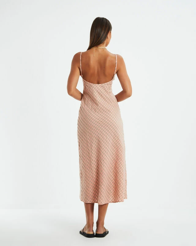 The Marina Bias Cut Midi Dress by Alice in the Eve comes in a pink colourway with a beige check throughout. The dress is designed in a midi length with a straight neckline, scoop back, adjustable straps and an invisible zipper. The dress is also crafted from a unique bias cut fabrication. Pair with sandals for a chilled summer vibe.
