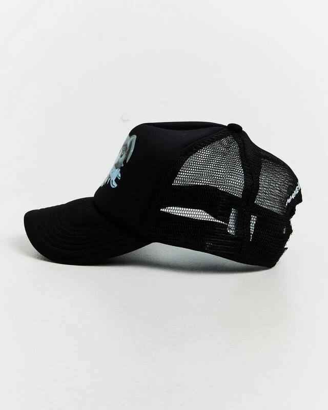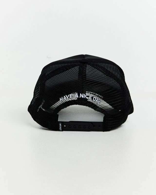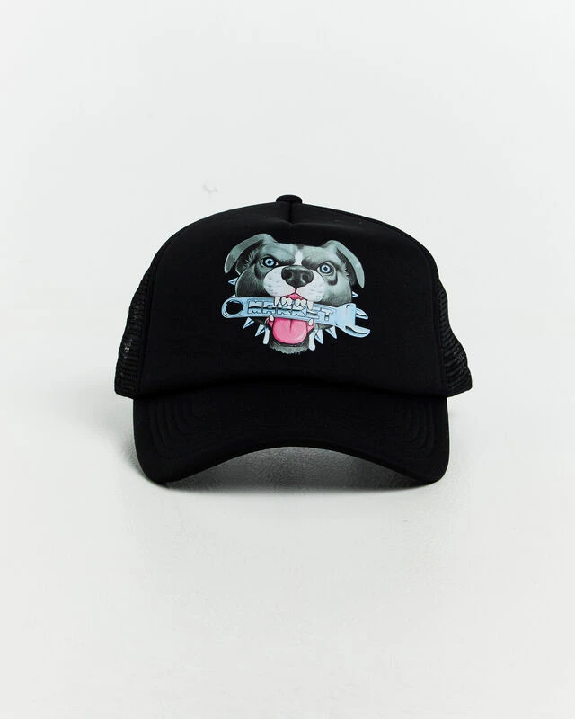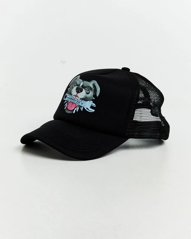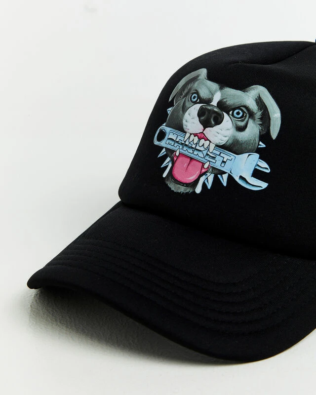 The Junkyard Dog Trucker Cap by Market comes in a black with a front graphic print. This style has been designed with a curved brim, tonal stitching, snapback fastening, woven logo tag at back and an interior mesh lining at front.