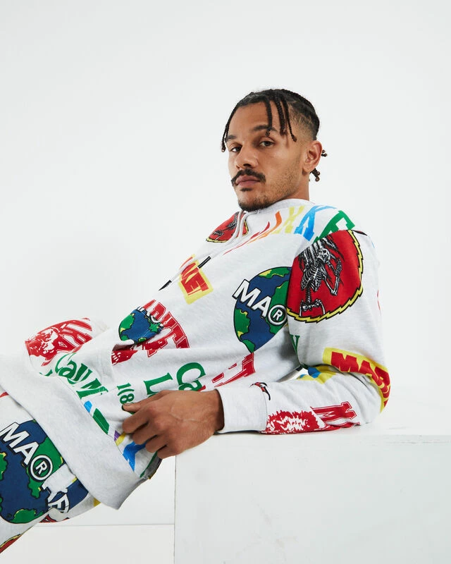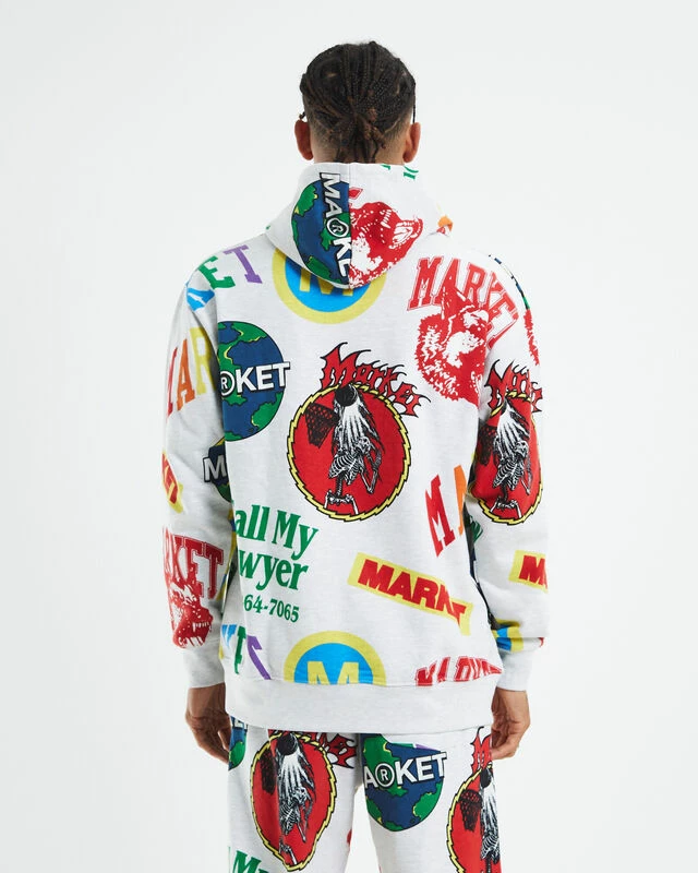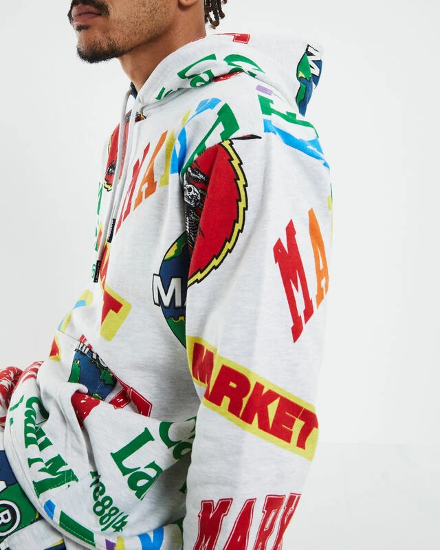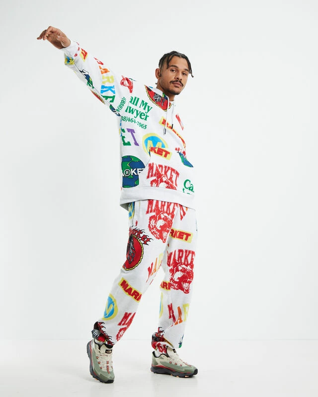 The Market Monogram AOP Hoodie by Market is crafted with vibrant branded graphics and comes in a white colourway. The jumper features a drawstring hood, ribbed trims and large graphics on front, back and sleeves. Pair it with matching trackpants and Converse with a beanie for an effortlessly cool look.