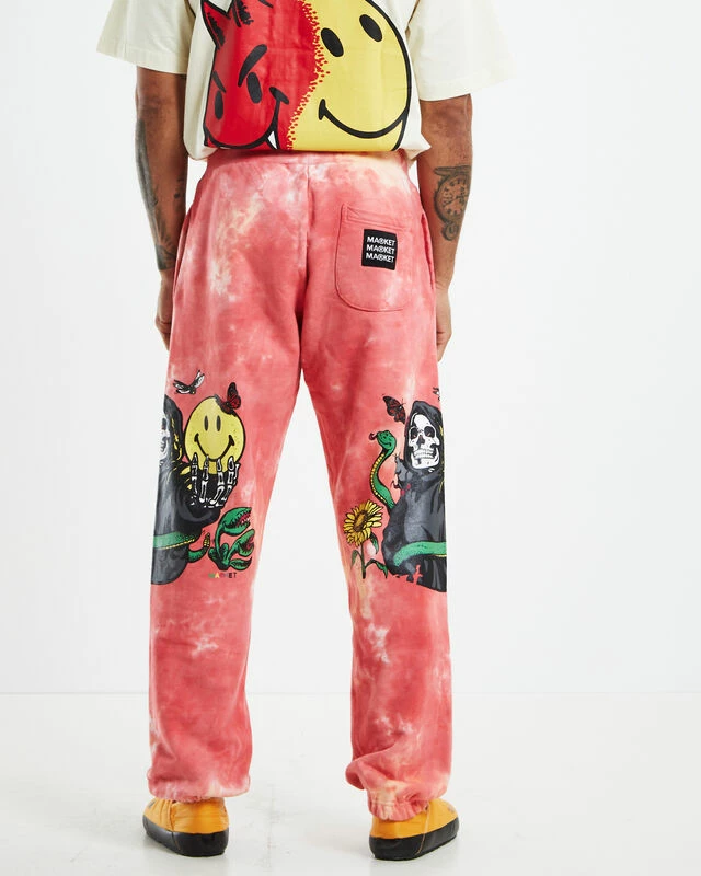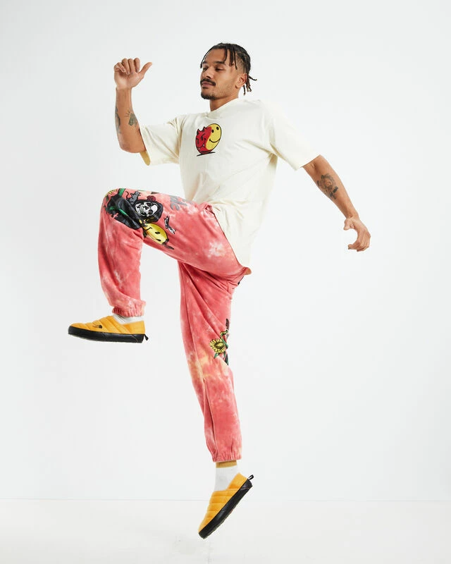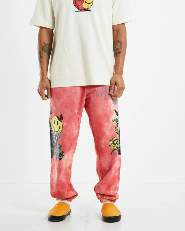 The Smiley Look At The Bright Side Tie-Dye Sweatpants by Market are a relaxed fit that comes in a bold colourway with graphic print. This style is full length and features three pockets and a drawstring waist. Throw them on with a black tee and Dr Martens for a more subdued look.