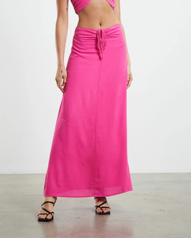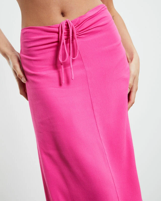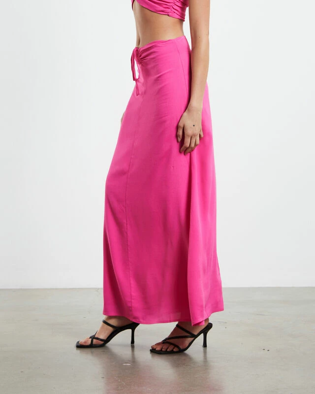 The Meadow Skirt by SNDYS is a relaxed fit maxi length skirt with a mid rise waist. The skirt comes in a pink colourway with a rear zipper opening and a ruching, tie-up detail in the front. Make it a two-piece set with the Meadow Top Pink.