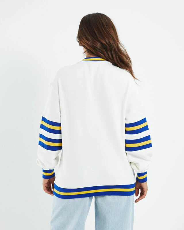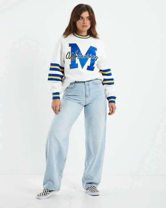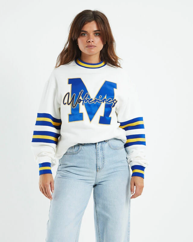 The University of Michigan Jumper by NCAA comes in a white colourway with blue and yellow detailing. The jumper features a ribbed neckline and ribbed cuffed sleeves, bold branding across centre chest and is a relaxed fit. Throw it on with a pair of dark wash denim jeans, a boyfriend blazer and Dr Martens for a cosy winter look.