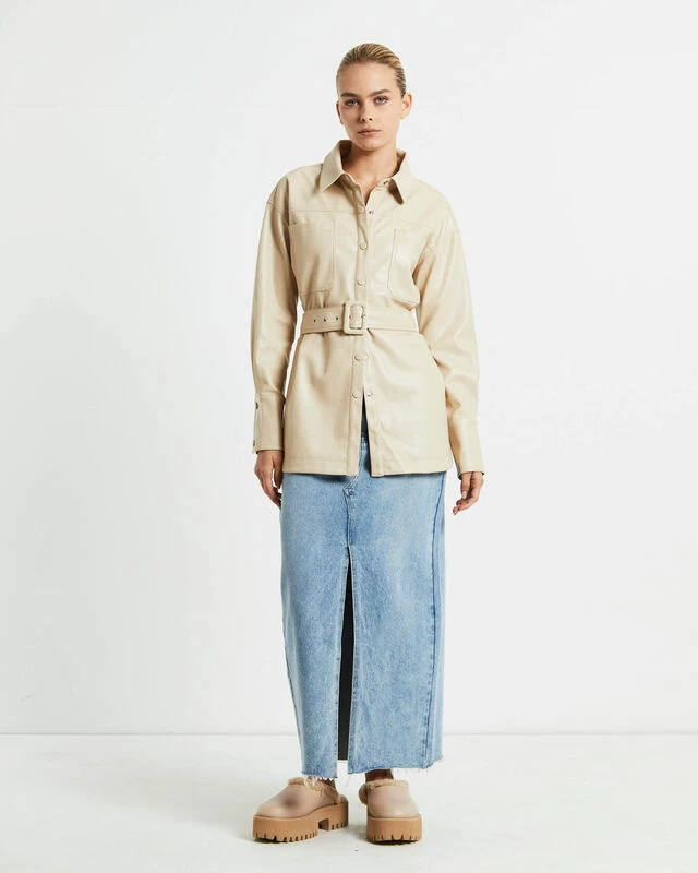 The Millie PU Utility Long Sleeve Overshirt by Alice In The Eve comes in a cream colourway and is constructed from a leather look fabrication. This style is designed with a button-up front, collared neckline, dual chest pockets and a belt detail.