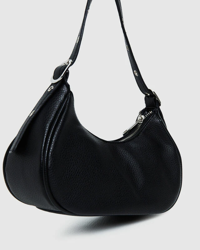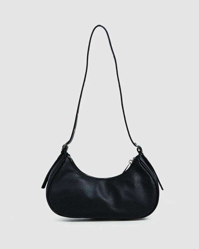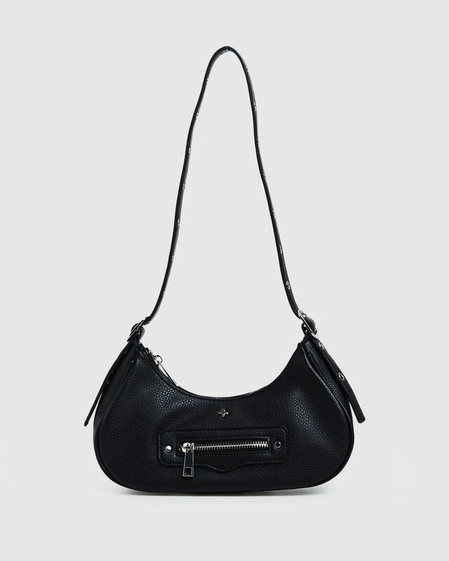 The Moto Bag by Peta + Jain comes in a black colourway with glossy pebbled finish. The bag is designed with a zip-up main compartment and features an exterior zip pocket, adjustable shoulder strap, internal zip pocket, silver-toned hardware, metal rivets and signature branding.