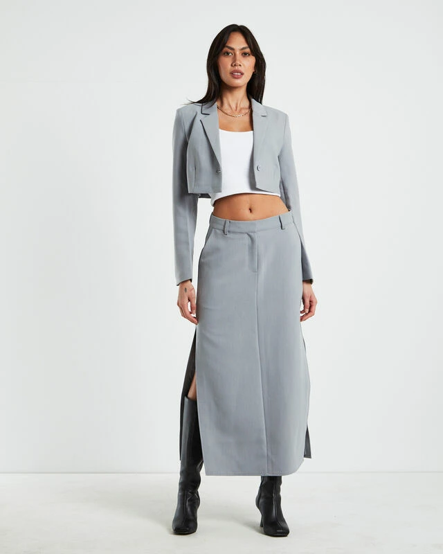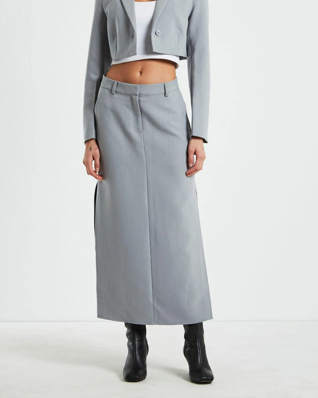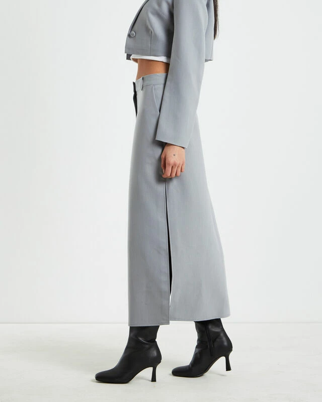 The Myla Tailored Pencil Skirt by Alice In The Eve comes in a dove grey colourway. This style is designed in a midi length featuring splits at both sides, zip-fly with clasp closure, belt loops, side pockets and centre seam detailing.