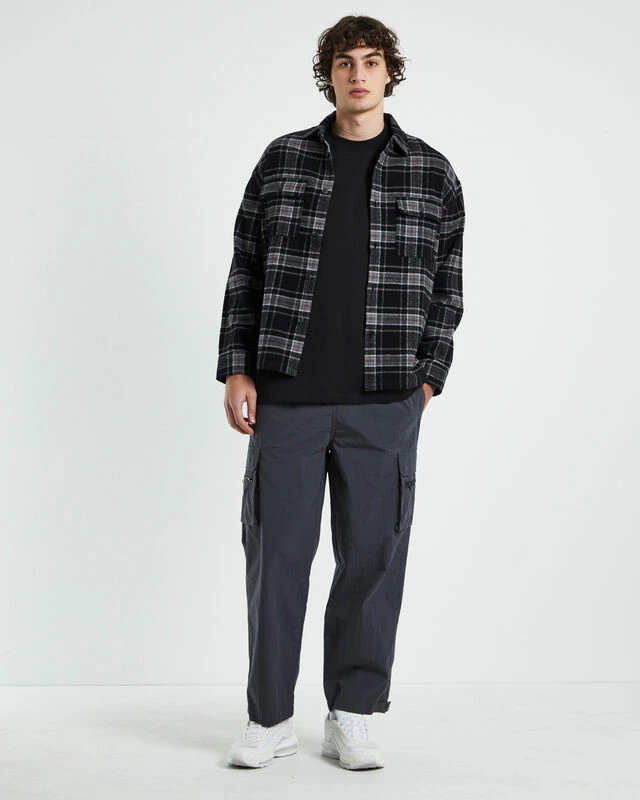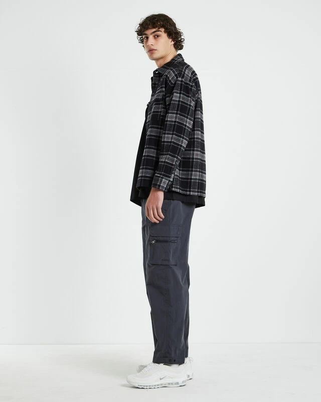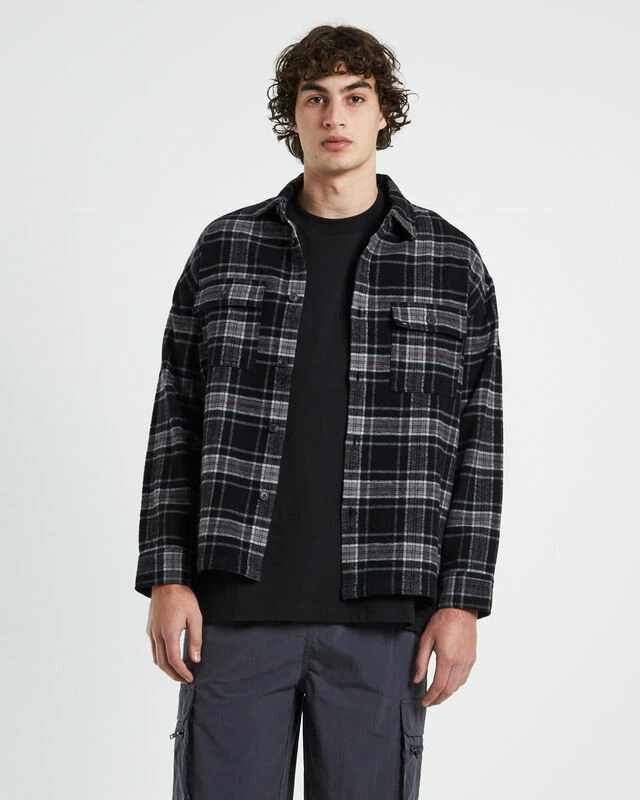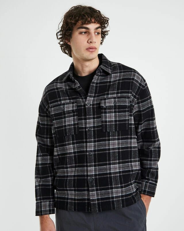 The Neo Long Sleeve Shirt by Standard is designed in a black checkered pattern. This style is a relaxed fit and features a collared neckline, button-up front, long sleeves and dual chest pockets.