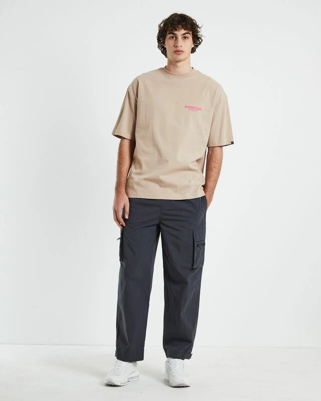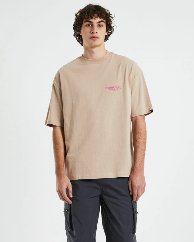 The Nigh Short Sleeve T-Shirt by Standard comes in a beige colourway with pink branding at left chest and across the reserve. The tee is a regular fit and features short sleeves and a ribbed crew neck.