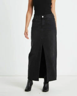 The Nila Skirt by SNDYS comes in a black colourway and has a denim fabrication. This style is designed in a midi length featuring a centre split, zip-fly with button closure, belt loops and 5 pocket styling.