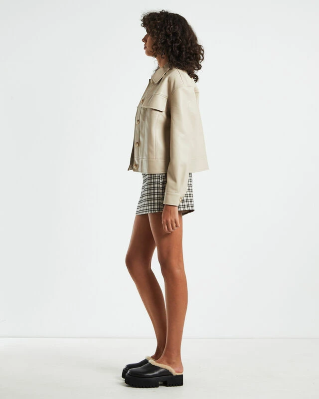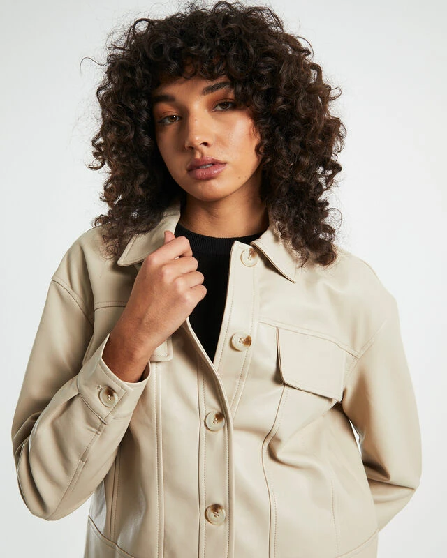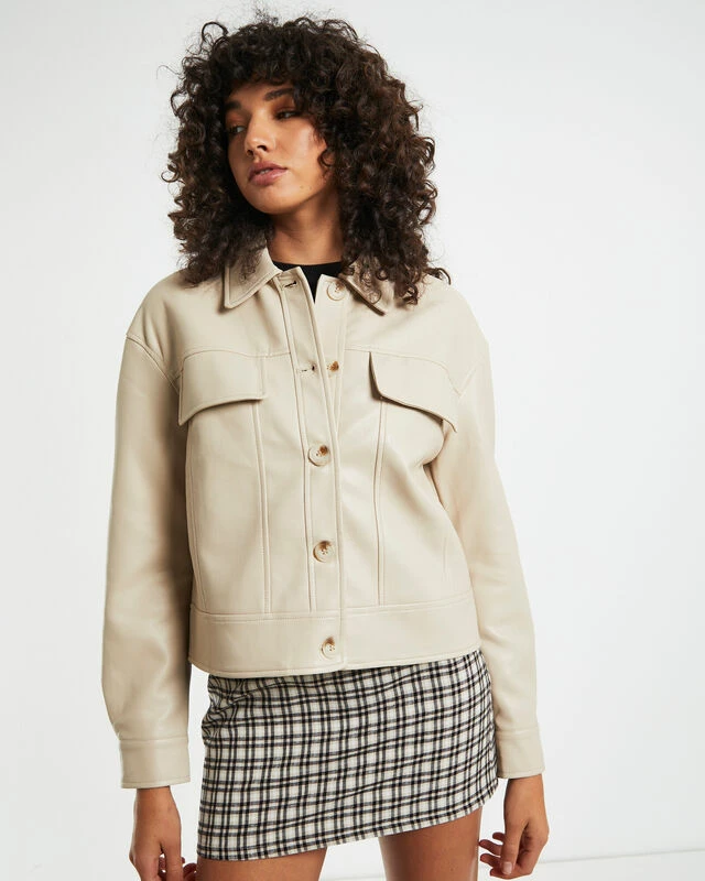 The Olga Leather Look Jacket by Subtitled comes in a cream colourway. This style is designed with a button-up front, dual chest pockets, collared neckline, buttoned cuffs and is crafted from a leather look fabrication.