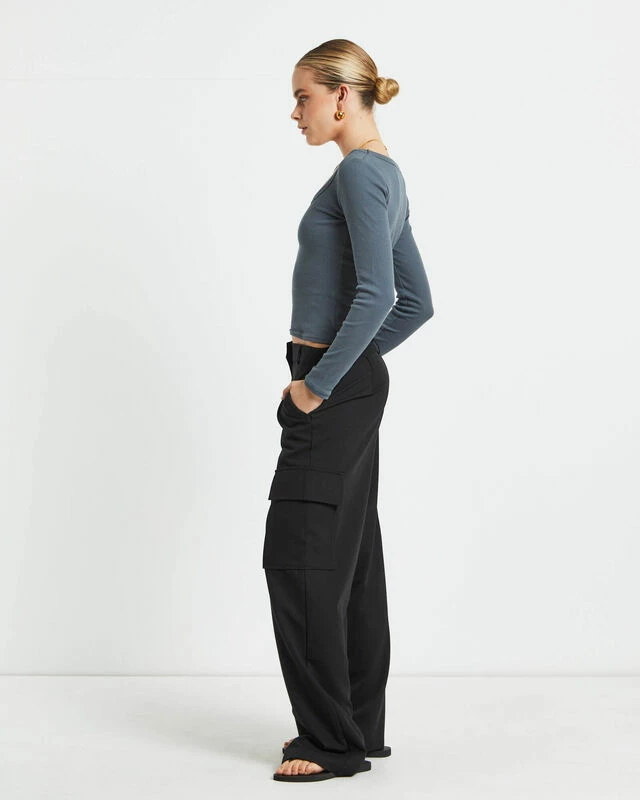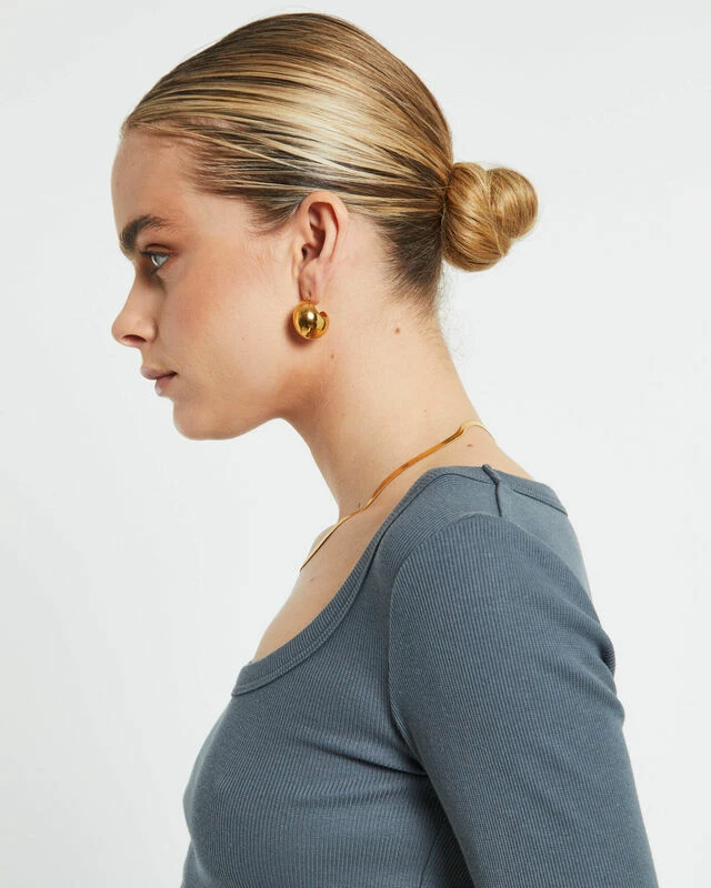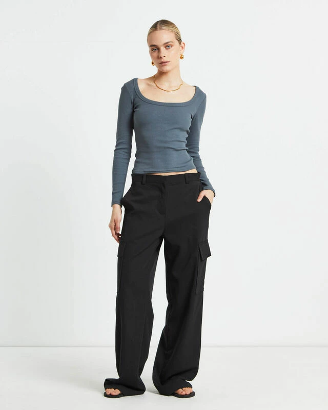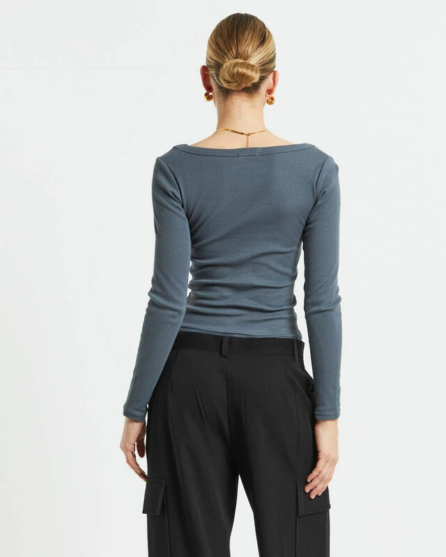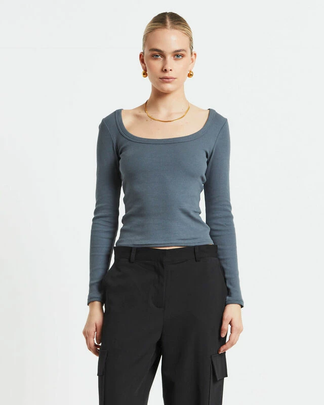 The Open Neck Long Sleeve Top by GP Co. Basics comes in a slate grey colourway. The top is fitted with a wide, scooped neckline and features a ribbed fabrication, long sleeves and is a regular length.