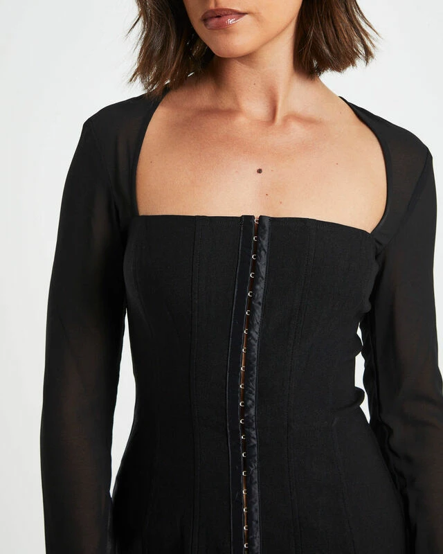The Orson Hook Front Panelled Dress by Neon Hart comes in a black colourway. This style is designed with a mini length, hook front, mesh long sleeves, square neckline and structured panelling.