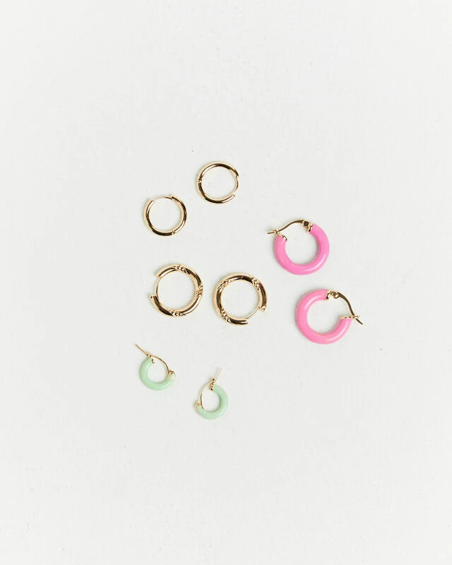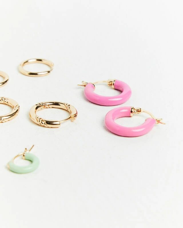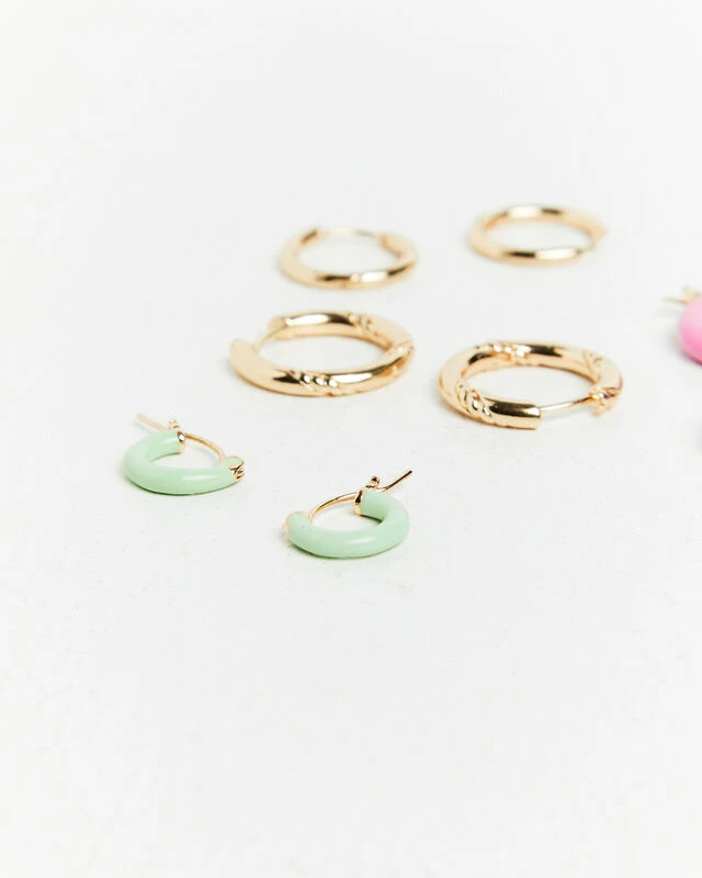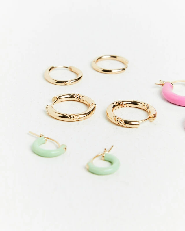 The Pastel Enamel Huggie Earring Pack by Alice in the Eve offer four unique huggie hoop designs. These pieces are made from a gold hardware and feature a hinged snap closure. Add these earrings on to elevate any outfit.
