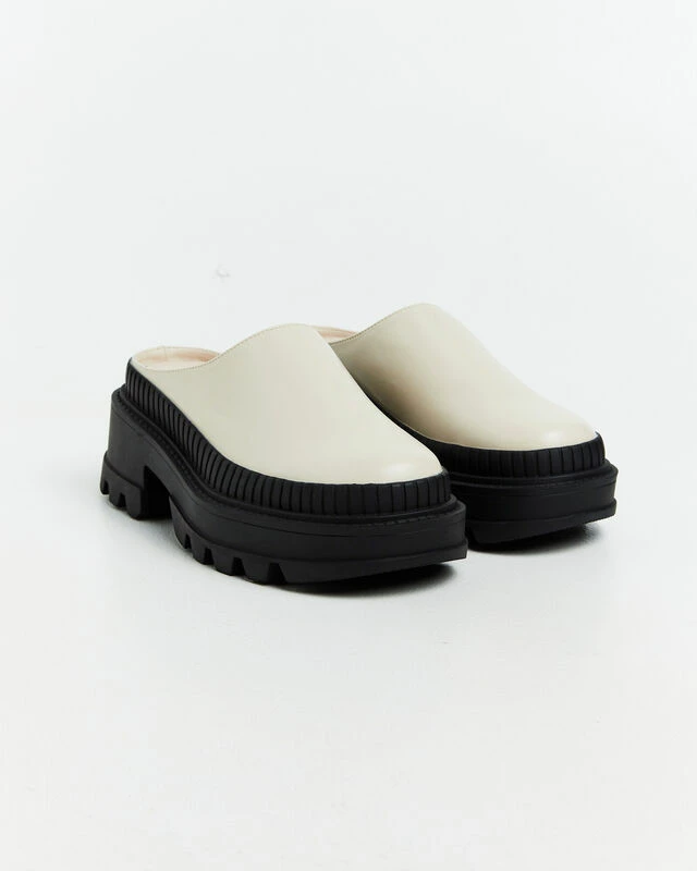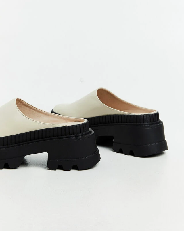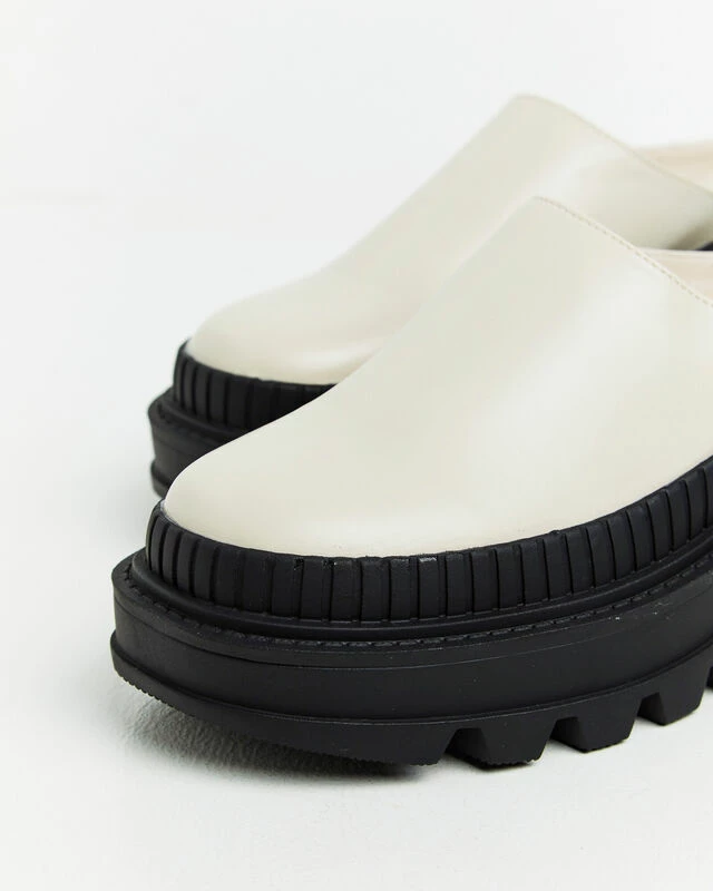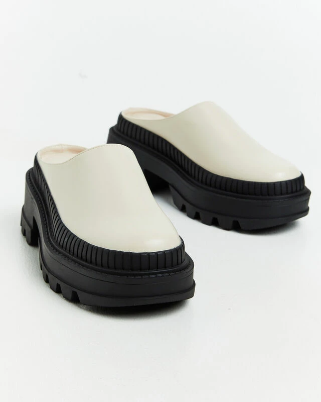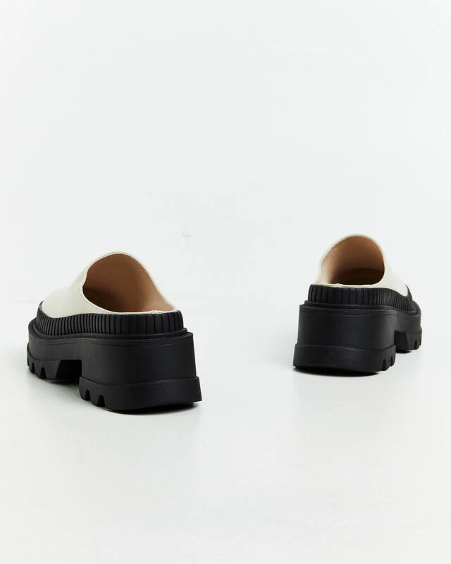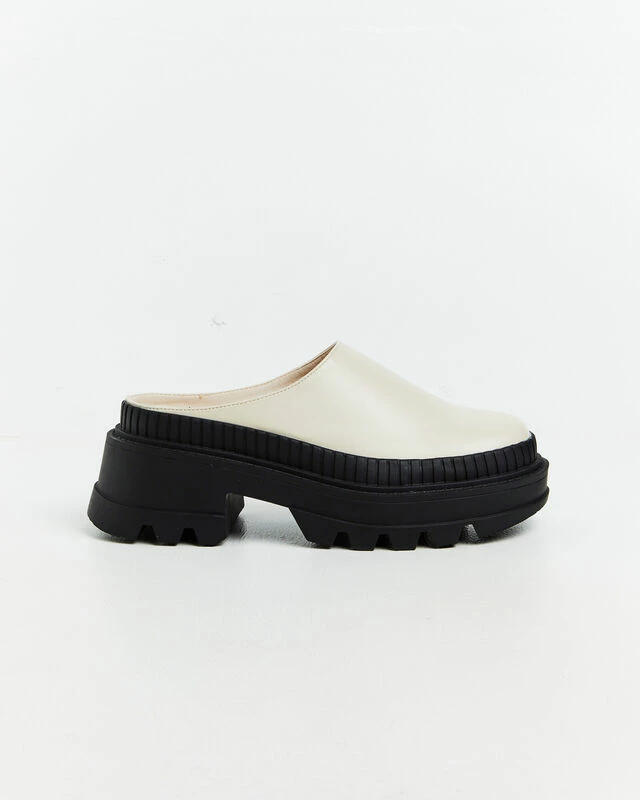 The Platform Clogs by Alice In The Eve come in a vanilla/black colourway. This style features a clog design, platform height and are a slip on style.