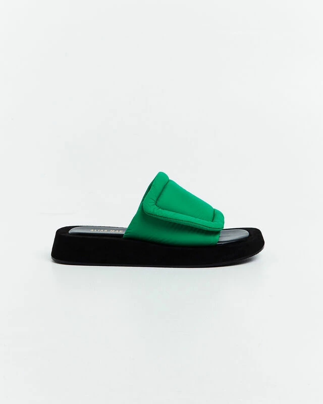 The Poet Slides by Alias Mae are a flatform style. The slides are a highlighter green colourway with an adjustable velcro.
