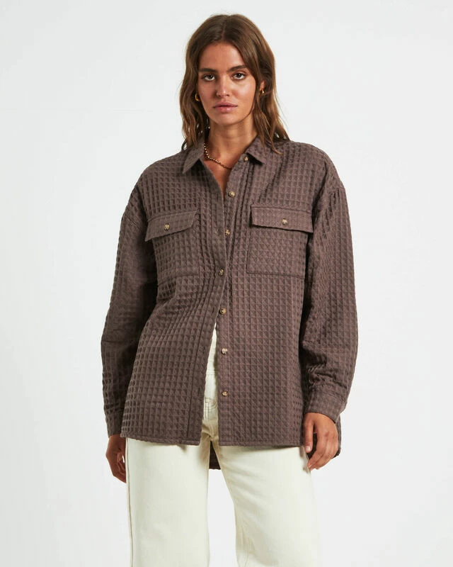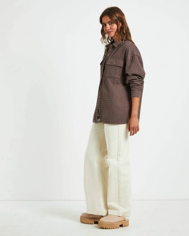 The Posey Oversized Waffle shirt by Subtitled comes in a mocha brown colourway and is crafted from a waffle textured fabrication. The shirt is designed with dual buttoned chest pockets, collared neckline, button-up front, curved hem, side splits and has an oversized fit.