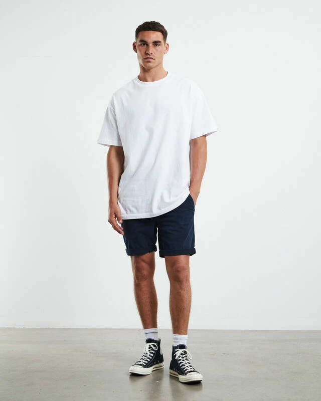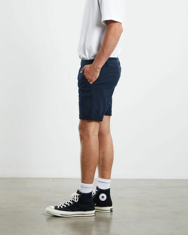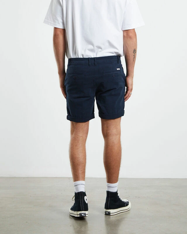 The Preston Shorts by Arvust are a comfy, wardrobe essential. This design features a zip button fly, belt loops, navy colourway, two side pockets and double welted pockets at the reverse. Roll up the bottom of the shorts and pair with a white linen shirt for a modern, sleek outfit.