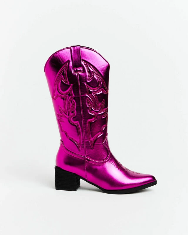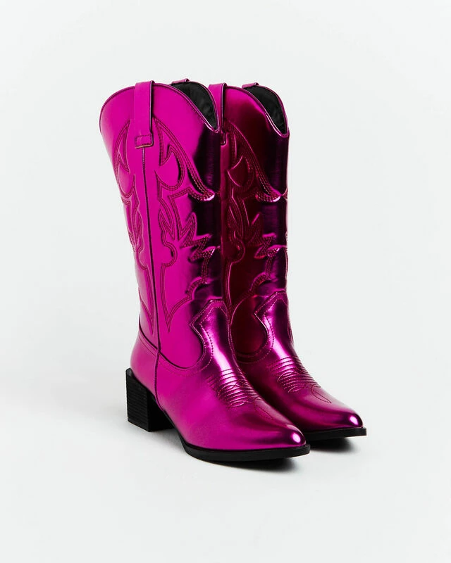 The Ranger Cowboy Boots by Therapy come in a metallic pink colourway. The shoes are a western-style design and are crafted with a pointed toe, mid height leather stacked heel and are a pull on design.