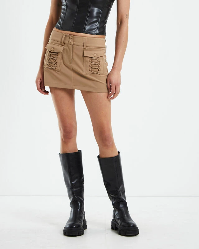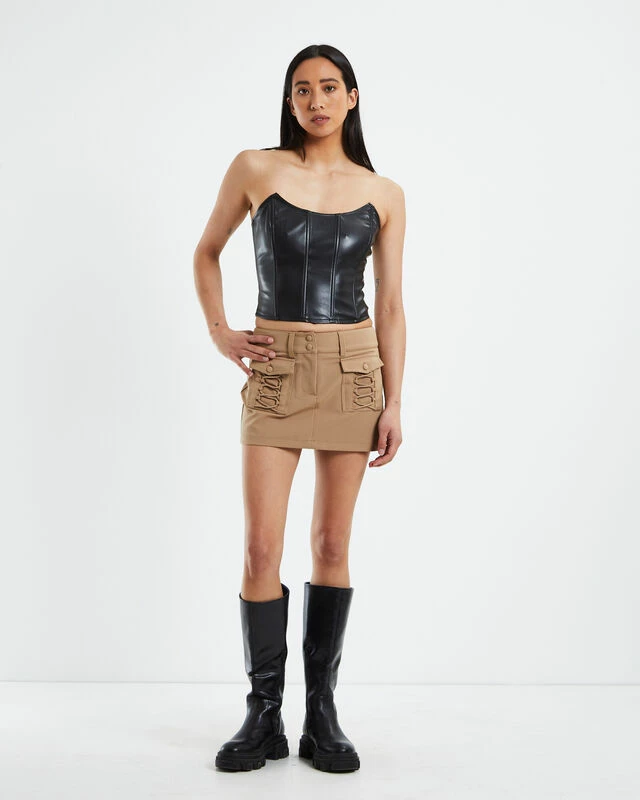 The Raquel Corset Detail Skirt by Neon Hart is a low rise skirt. This style comes in a beige colourway and features a zip fly with button closure, two pockets and belt loops. Complete the look with a leather corset and cowboy boots for a fun and fresh fit.