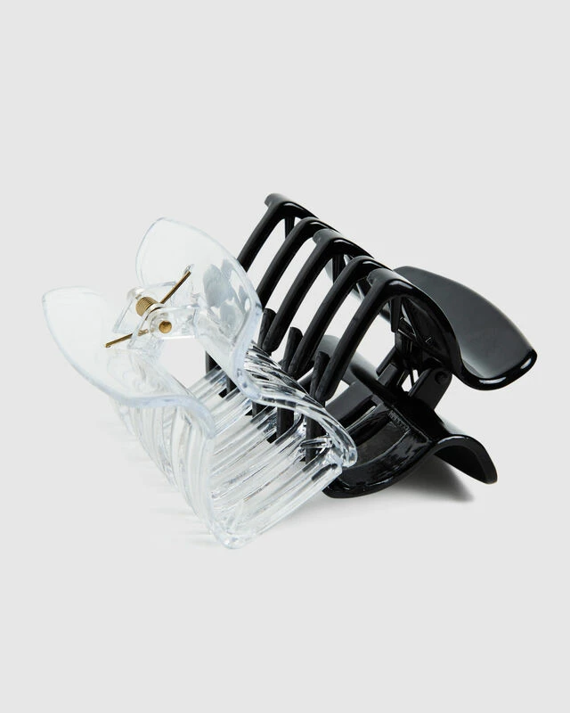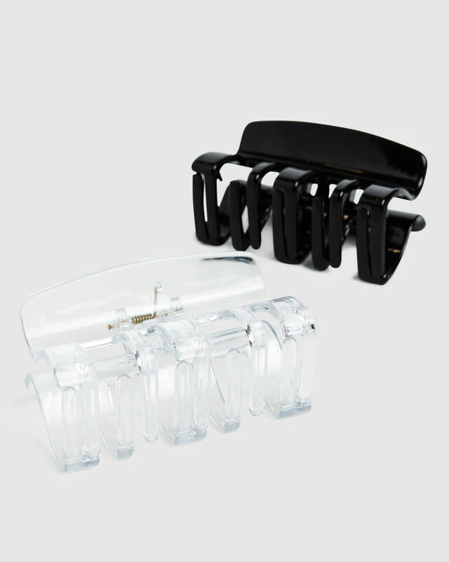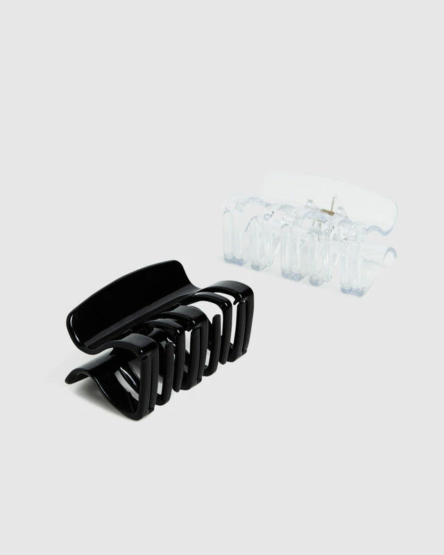 The Rectangle Claw Clip by Subtitled come in a pack of two. The clips are designed in a black and clear colorway. Featuring a seven-tooth design and pinch-clip opening.