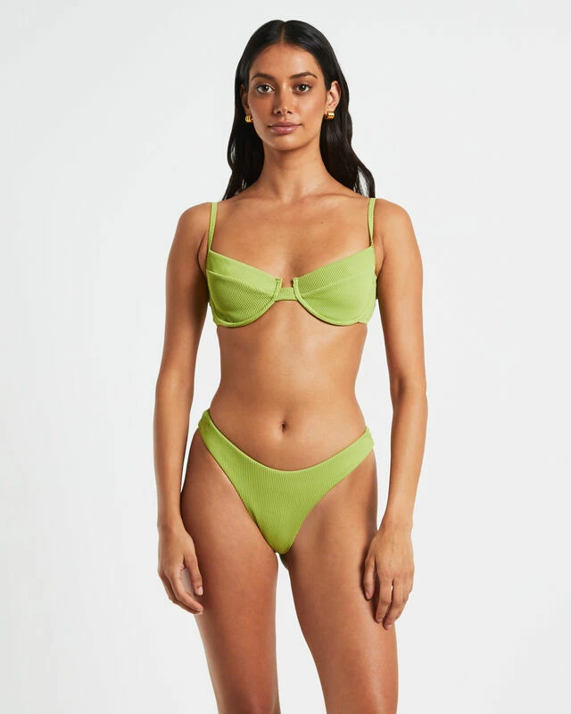 The Rib Cut Out Underwire Bikini Top by Subtitled comes in a citrus green colourway. The top is designed with underwire cups and features adjustable shoulder straps, ribbed fabrication and a clasp closure at reverse. Mix and match our new season swimwear in a range of shapes and colours for different looks and styles.