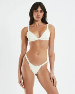 The Fixed Triangle Bikini Top by Subtitled features soft triangle cups and comes in an off white colourway. The bikini top is designed with a soft ribbed material and has adjustable shoulder straps and an e-hook close at reverse. Mix and match our new season swimwear in a range of shapes and colours for different looks and styles.