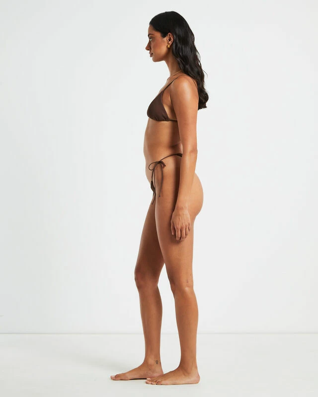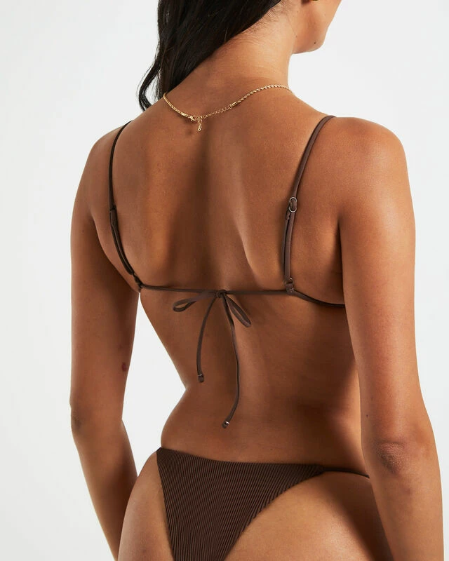 The Rib Skinny Strap Triangle Bikini Top by Subtitled comes in a chocolate brown colourway. The top features ribbed fabrication, adjustable straps, adjustable tie closure at the back and is a classic triangle cut. Mix and match our new season swimwear in a range of shapes and colours for different looks and styles.