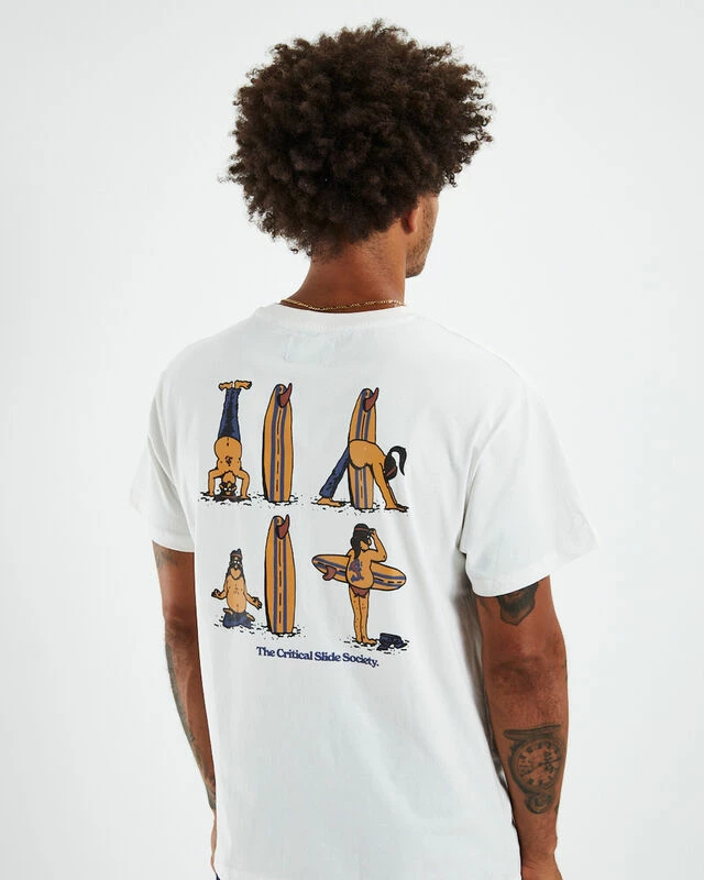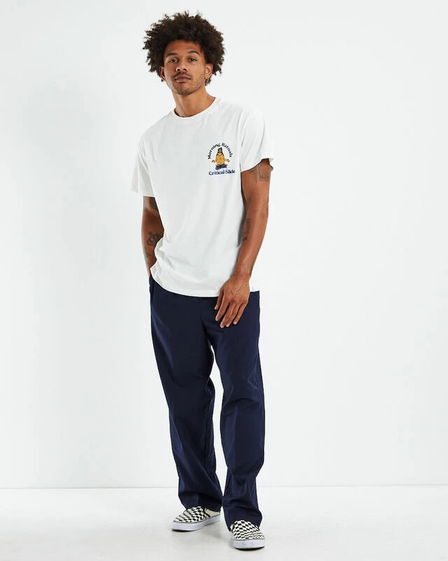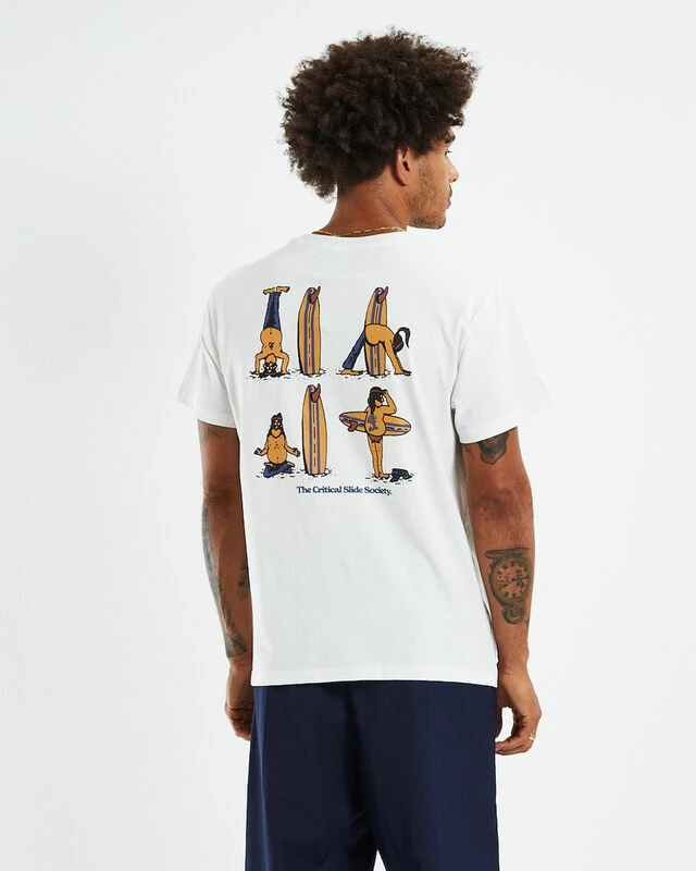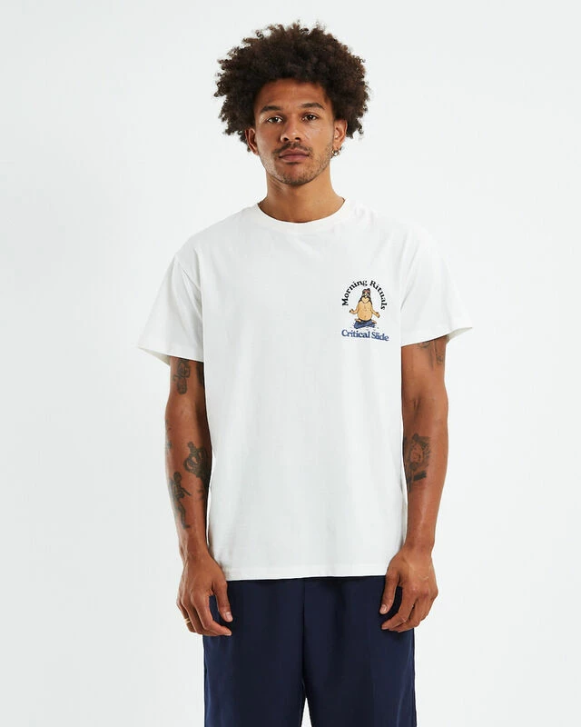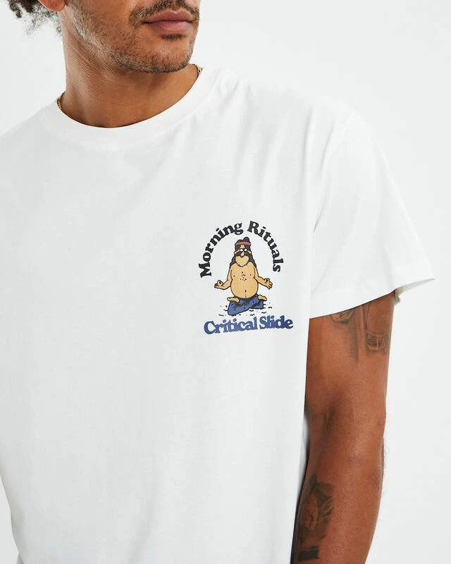 The Rituals Regular Fit T-Shirt by Critical Slide Society comes in a white colourway, This style is designed with signature branding at the left chest and centre back, short sleeves, ribbed crew neckline, straight hem and is crafted in a cotton fabrication. Pair back with pants and slip-on Vans for a casual look.
