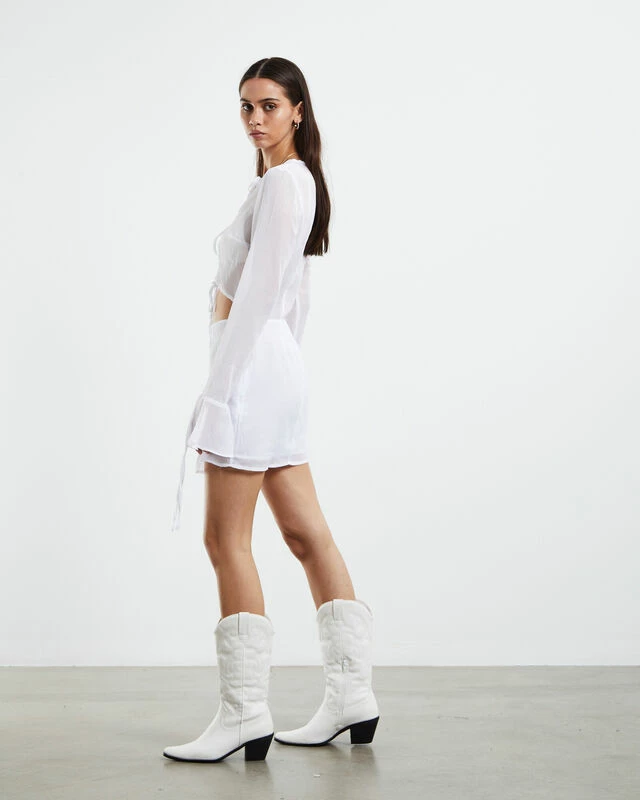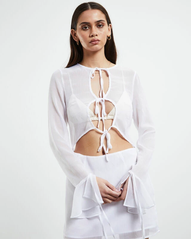 The Riviera Dress by SNDYS is crafted from a lightweight fabrication and is a sheer style. The dress comes in a white colourway and features a lined skirt, mini length, tie-up front details and long bell sleeves with a tie-up detail. Complete the look with a lace bralette and strappy heels.