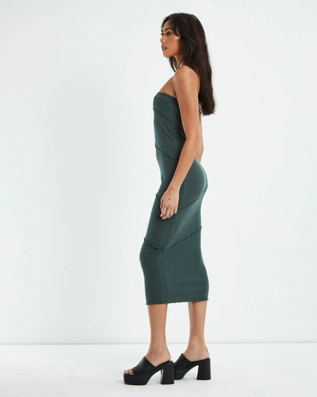 The Robyn Exposed Seam Strapless Midi Dress by Neon Hart is a midi length dress that is crafted in a stretch rib fabrication. The dress comes in a slate grey colourway and features an exposed seam design throughout, strapless design. Pair back with a chunky heel for your next night out with the girls.