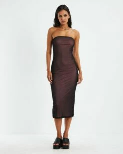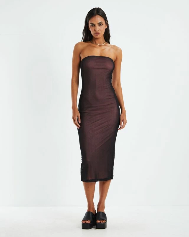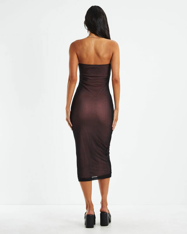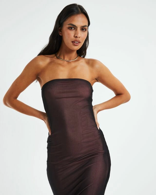 The Rosbandi Dress by Motel Rocks comes in a sheer black colourway with a pink lining. The dress is a midi length with a strapless neckline and bodycon silhouette. Throw on with platform mules and a shoulder bag for an edgy yet elegant vibe.