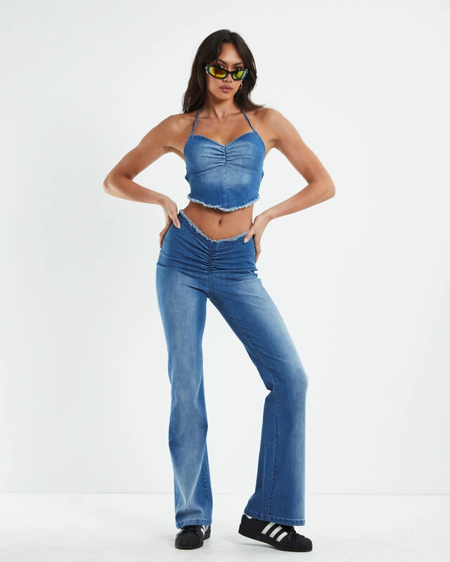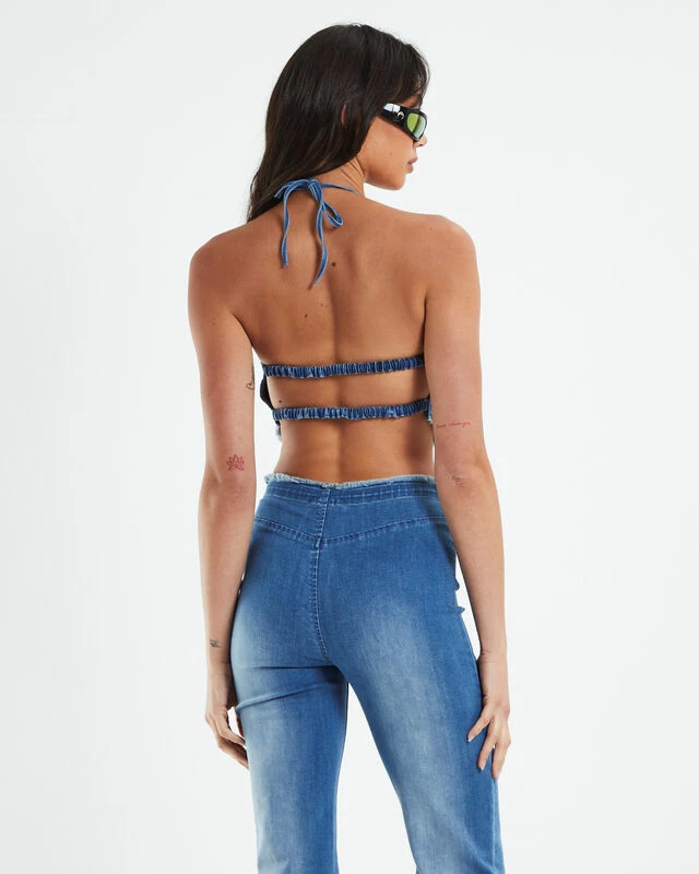 The Roxanne Hanky Hem Halter Top by Neon Hart come in a blue colourway with a denim-like wash. The top is a cropped fit with an adjustable halter neckline. Featuring an open back design, two ruched elasticated bands on the rear, frayed hemline and ruched detailing on centre-chest. Make it a two-piece set with the Roxanne Deep Front Ruched Stretch Pants