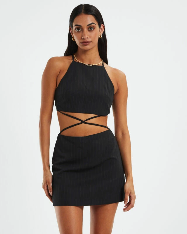 The Sabrina Pinstripe Cut Out Dress by Alice In The Eve is a black colourway with fine pinstripe detailing. The dress is a mini length with a high neckline, cut-out detailing, open back with adjuastable cross ties and hidden zipper on the side. Style with boots and a clutch for a fun night out with the girls.