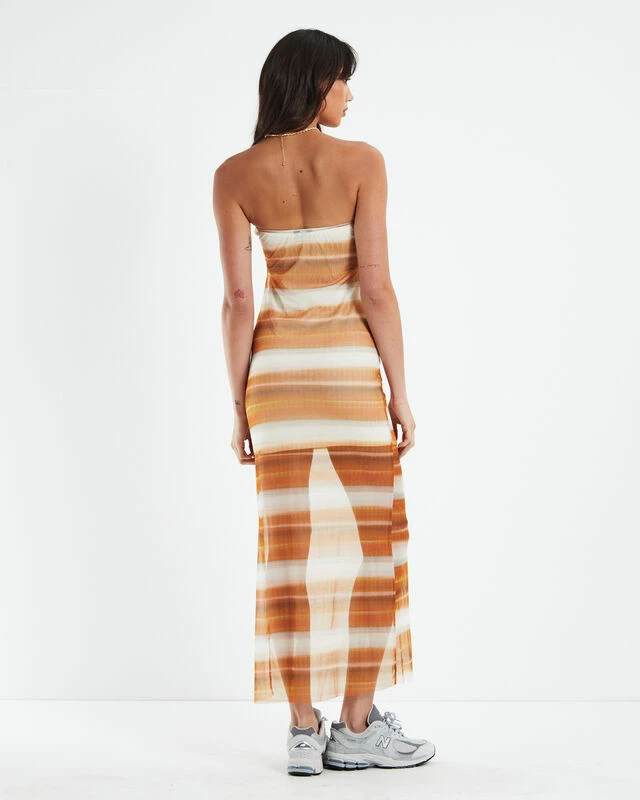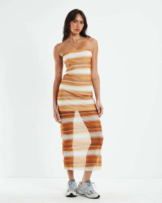 The Saskia Tube Dress by Alice In The Eve is a sunset stripe assorted colourway with sheer fabrication. The dress is a midi length with mini length lining, strapless neckline and stretchy fabrication. Throw on with a pair of heels for a fun date night look.