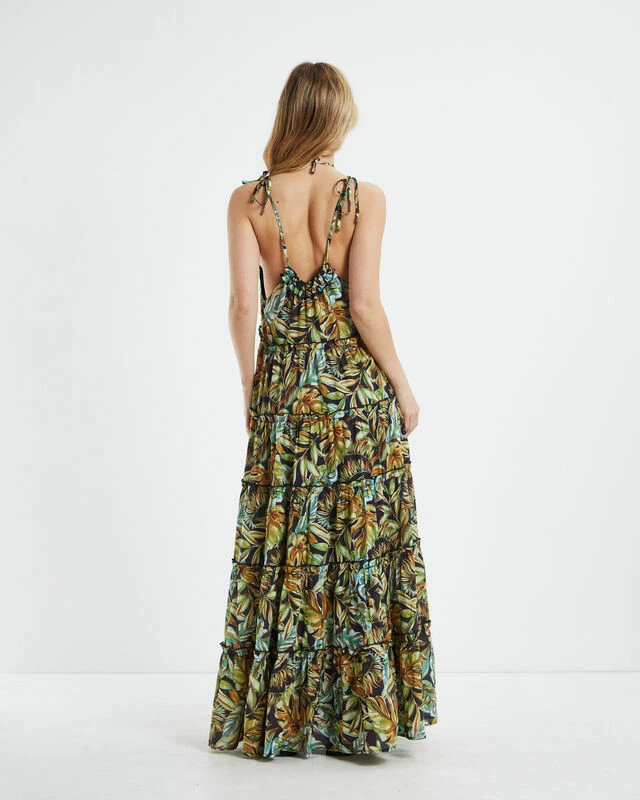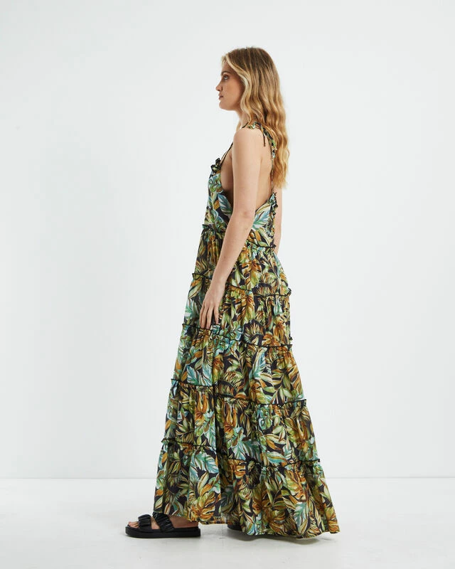 The Senorita Maxi Dress by Charlie Holiday is designed with cascading tiers and frills. The maxi dress is crafted with a tropical inspired print and is a loose fit. Featuring shoestring shoulder straps with ties and a dual front ties. This dress is perfect for the warmer months and can easily be paired back with black sandals and a shoulder bag.