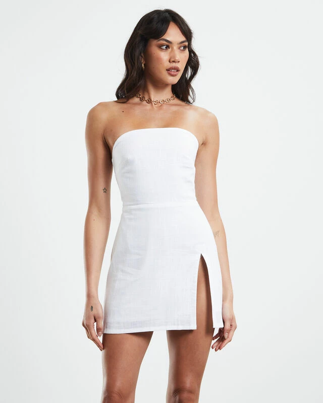 The Serena Mini Dress by SNDYS is a the perfect summer staple. This mini length dress in a white colourway with a high slit on the left leg. The dress has a tight fitting strapless top and a-line bottom. It features an invisible zipper and an elasticated backing. Dress it up with a pair of black cowboy boots for a fun night out with the girls.