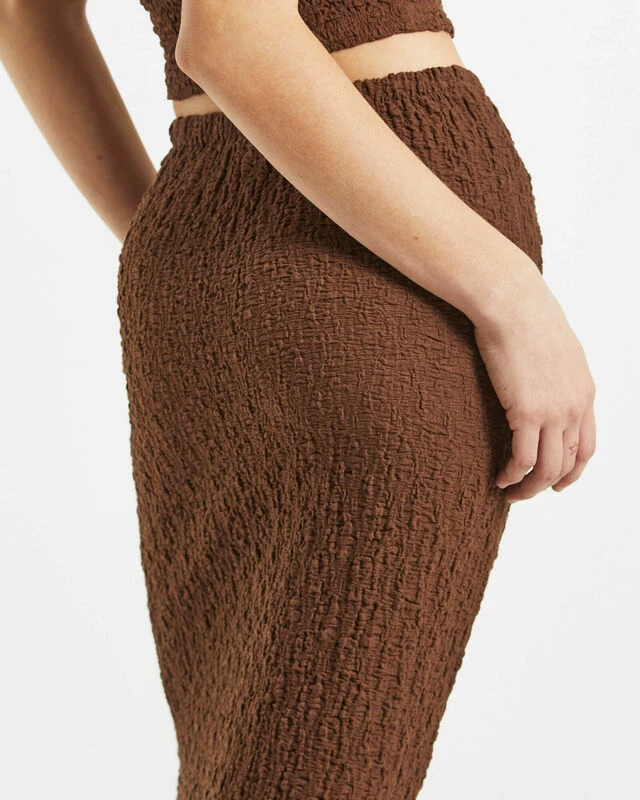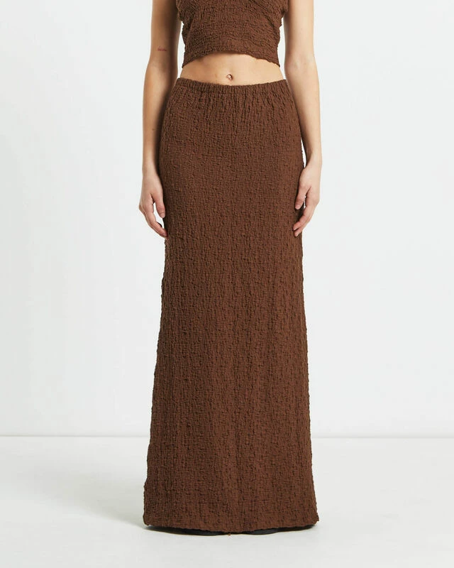 The Skyla Textured Maxi Skirt by Subtitled comes in a hazelnut colourway. This style is desiged with a maxi length featuring a textured fabrication, elasticated waistband and a slight a-line shape at the bottom. This skirt can be worn both high rise and low rise at the hips.