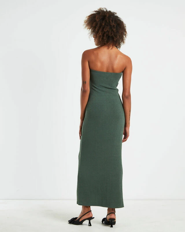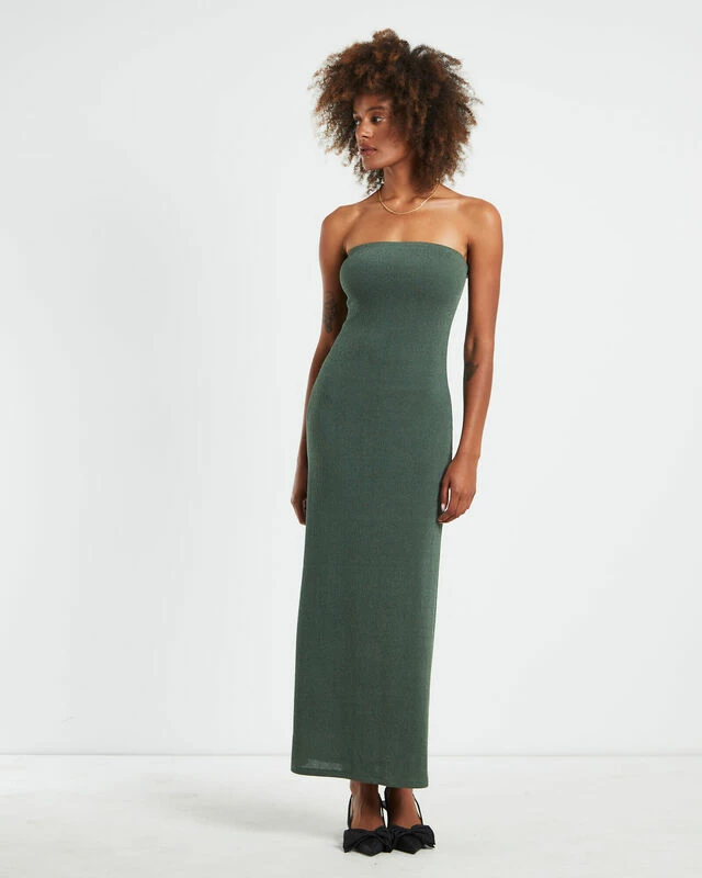 The Sloane Seamless Tube Dress by Alice In The Eve comes in a green colourway with a check print and knitted fabrication. The dress in a midi length and features a strapless neckline.