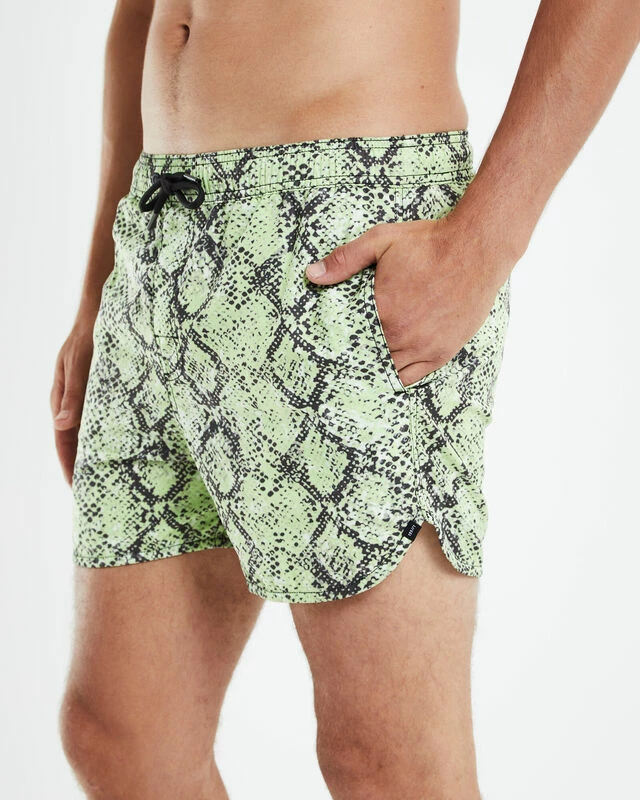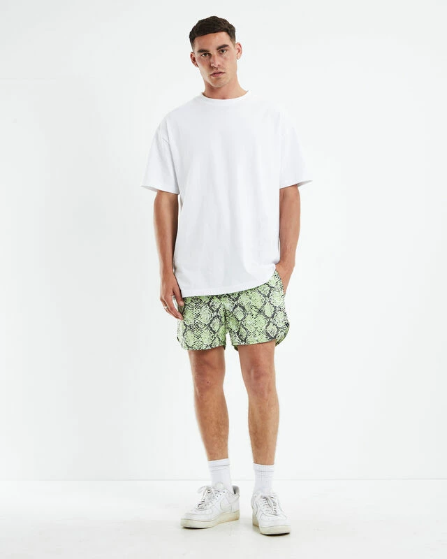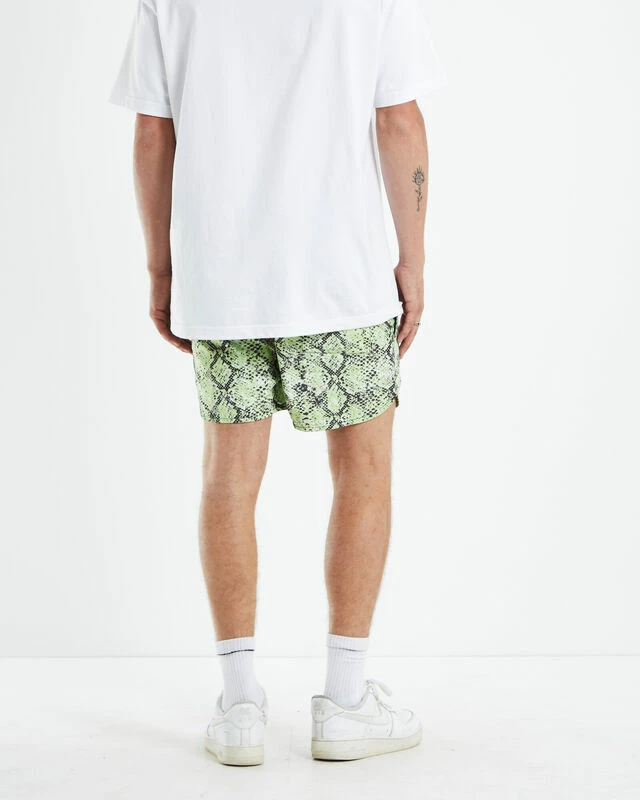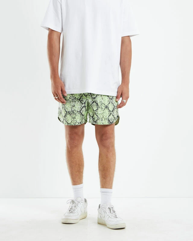 The Snake Eyes Boardshorts by Standard come in a neon green colourway with a contrast snake print. The shorts are designed with an elasticated drawstring waistband and feature three pocket styling and signature branding. Pair it back with a black basic tee and sneakers for a vibrant summer look.