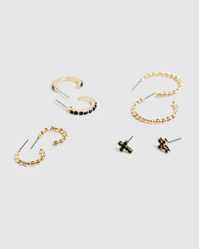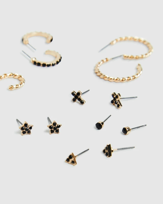 The Stella Earring Pack by Alice In The Eve comes in a pack of nine pairs. The earrings are gold and black tones. Featuring multiple designs, from studs to hoops.