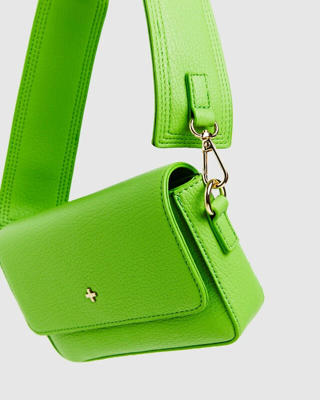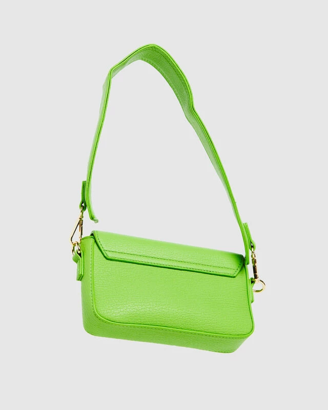 The Stella Shoulder Bag by Peta & Jain comes in the apple green colourway featuring signature gold hardware. The bag is designed in a small rectangle shape with snap button flap, thick short shoulder strap and is crafted with a croc texture.