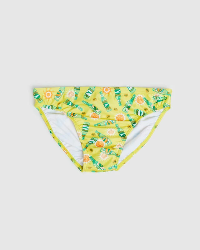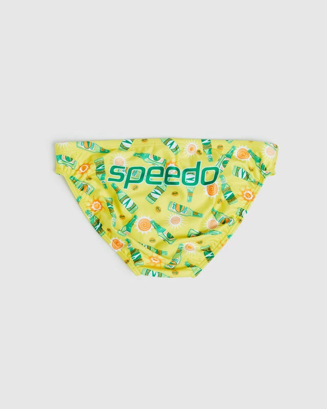 The Sundowners Speedos by Speedo are a bold 5cm brief, with a yellow colourway, featuring a bottle print. This design are comfy to wear with a drawstring waist, high chlorine resistance and made from recycled plastic bottles for a style that feels good both off and on.