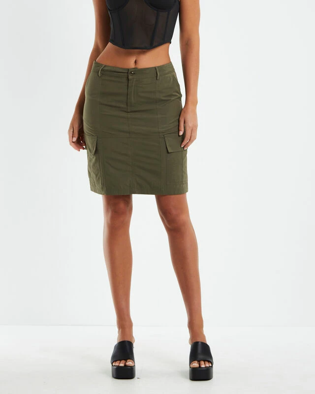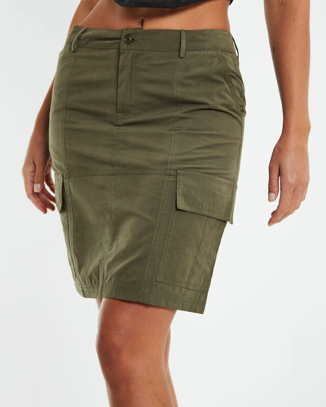 The Tibby Utility Skirt by Neon Hart comes in a khaki colourway. Featuring a low rise waistband, zip fly with button closure, straight fitted silhouette, belt-loops, two in-seam pockets and two utility pocket at side. Pair back with a cropped singlet and Dr Martens to complete the look.