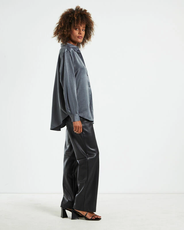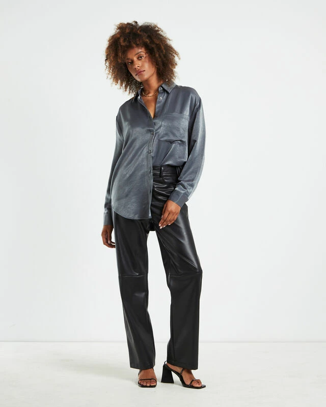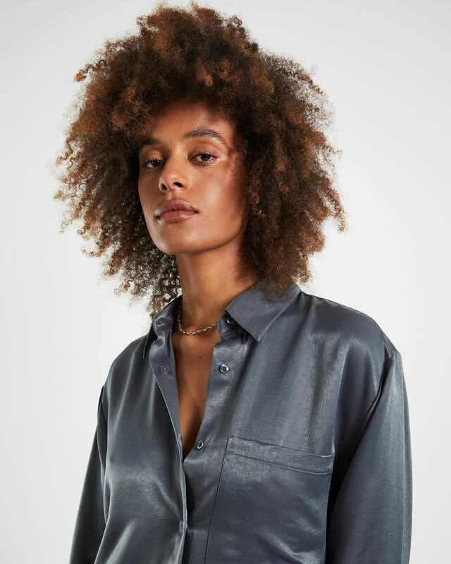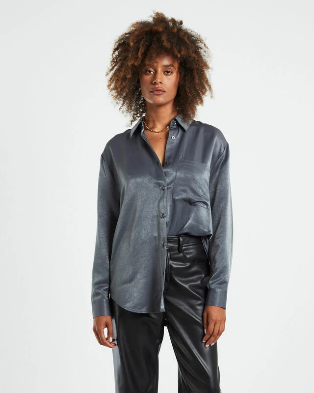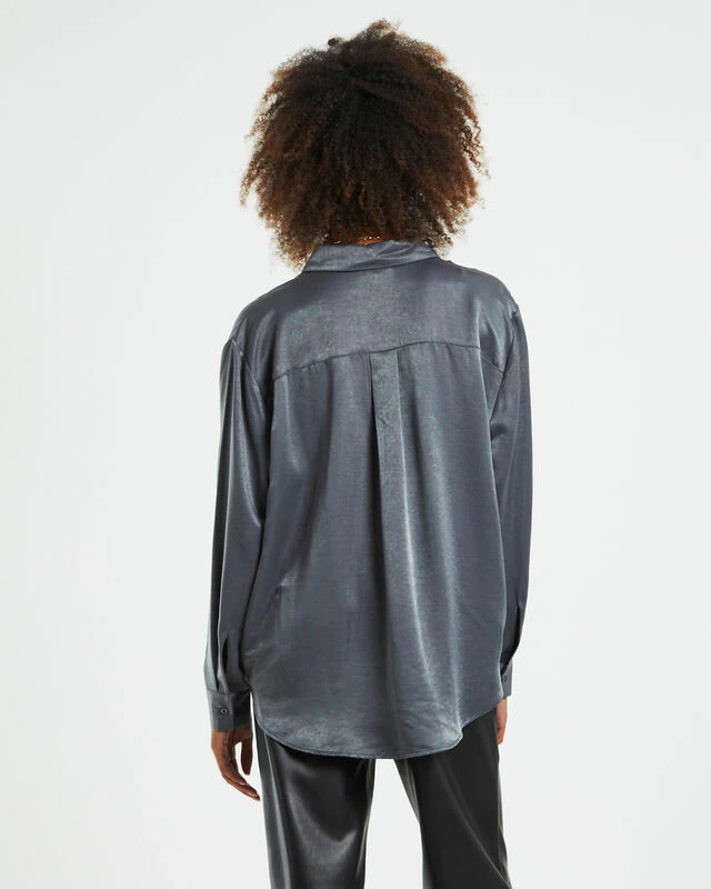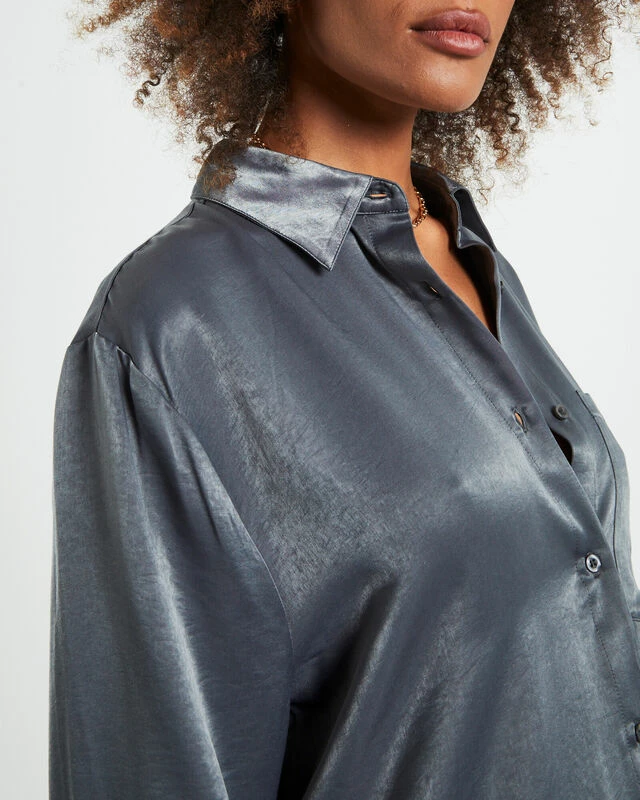 The Tina Silky Oversized Shirt by Alice In The Eve comes in a charcoal colourway. The top is designed in a relaxed fit, curved hemline, button up front and collared neckline.