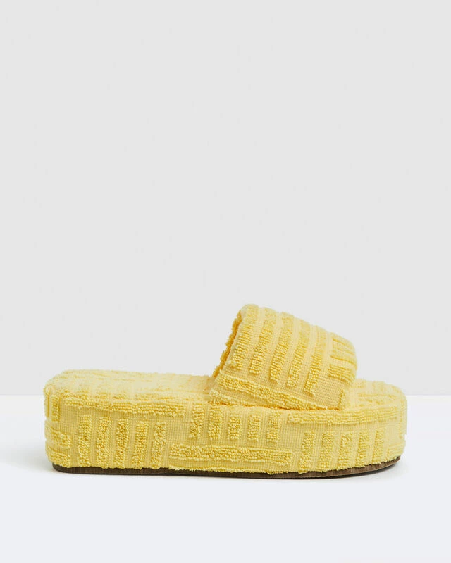 The Tori Terry Slides by Alice In The Eve come in a bright yellow colourway and feature a flatform sole. They are made from a soft towelling fabrication and are designed with a round toe.