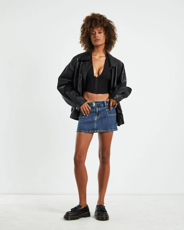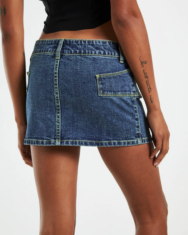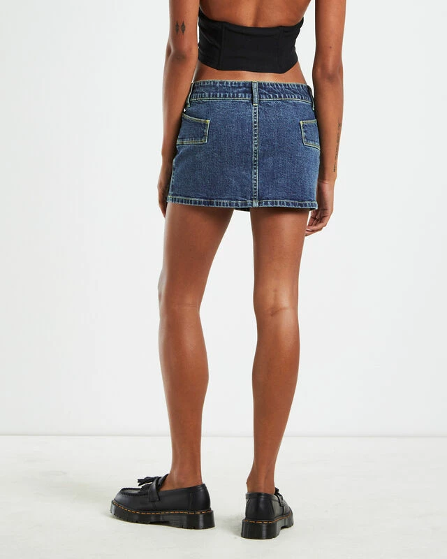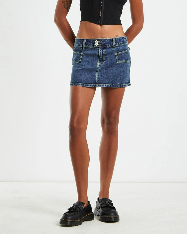 The Trinity Low Rise Denim Mini Skirt by Neon Hart comes in a dark blue wash and has a low rise. The skirt is designed with unique side pockets, double button closure with zip fly, belt loops and mini length. Pair this skirt with a top and loafers and throw over a leather jacket for an elevated look.