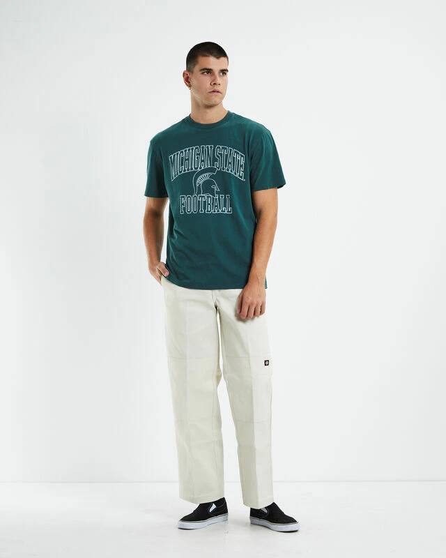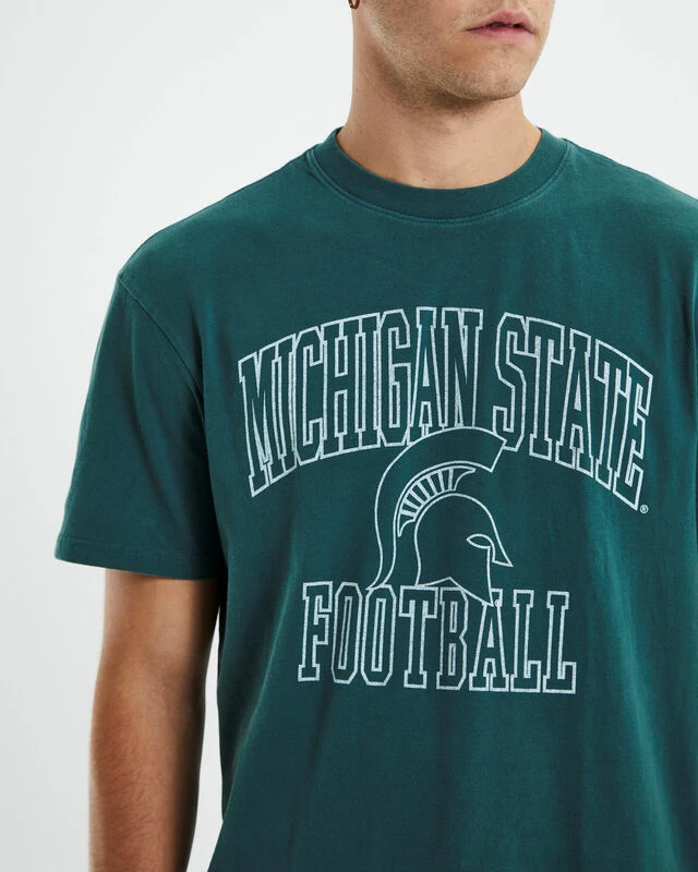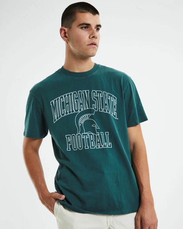 The Vintage Arch Michigan State University T-Shirt is a regular fit shirt with a faded green colourway. The t-shirt features large print on the chest centre ‘Michigan State Football’, short sleeves, crew neckline and a straight hem. An effortlessly cool shirt for a day out or pair back with chinos and boots for a more night time look.